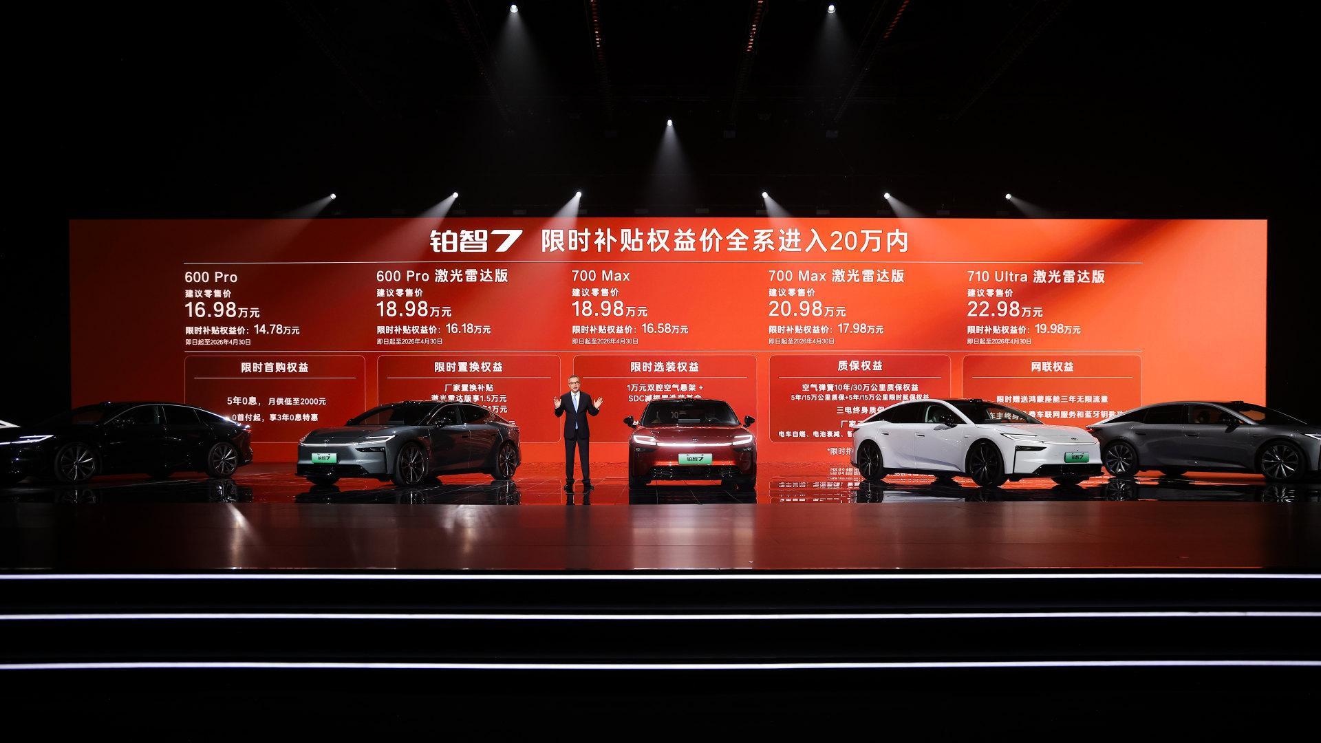 3月29日,丰田首款鸿蒙座舱豪华旗舰大型纯电轿车铂智7正式上市,新车共推出600km和700km两种续航5款配置,限时补贴权益价14.78万—19.98万元,综合后全系进入20万内,并针对首购车主推出5年0息金融方案,而预售期间已经累计收获订单超1万台。